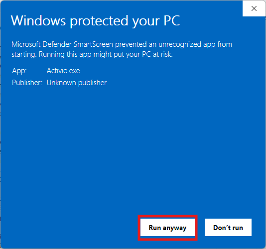 När nedladdningen är klar och installationen nästan är färdig kan följande ruta dyka upp. Välj ”Run anyway” så att Activio kan slutföra installationen och starta betaversionen av klienten.
