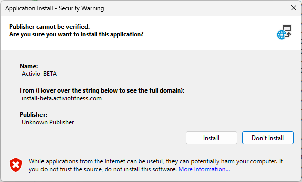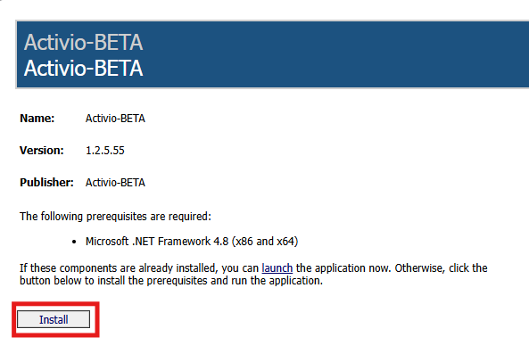 Klicka på ”Install” för att påbörja nedladdningen av installations programmet för Activio beta.