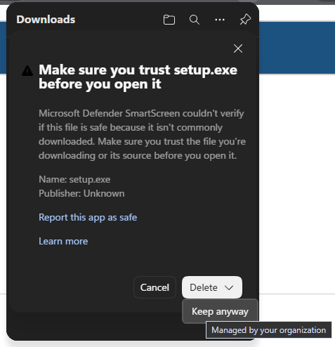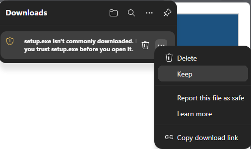 Klicka därefter på ”Keep” för att tillåta att installationsprogrammet för betaklienten sparas till din enhet/dator.